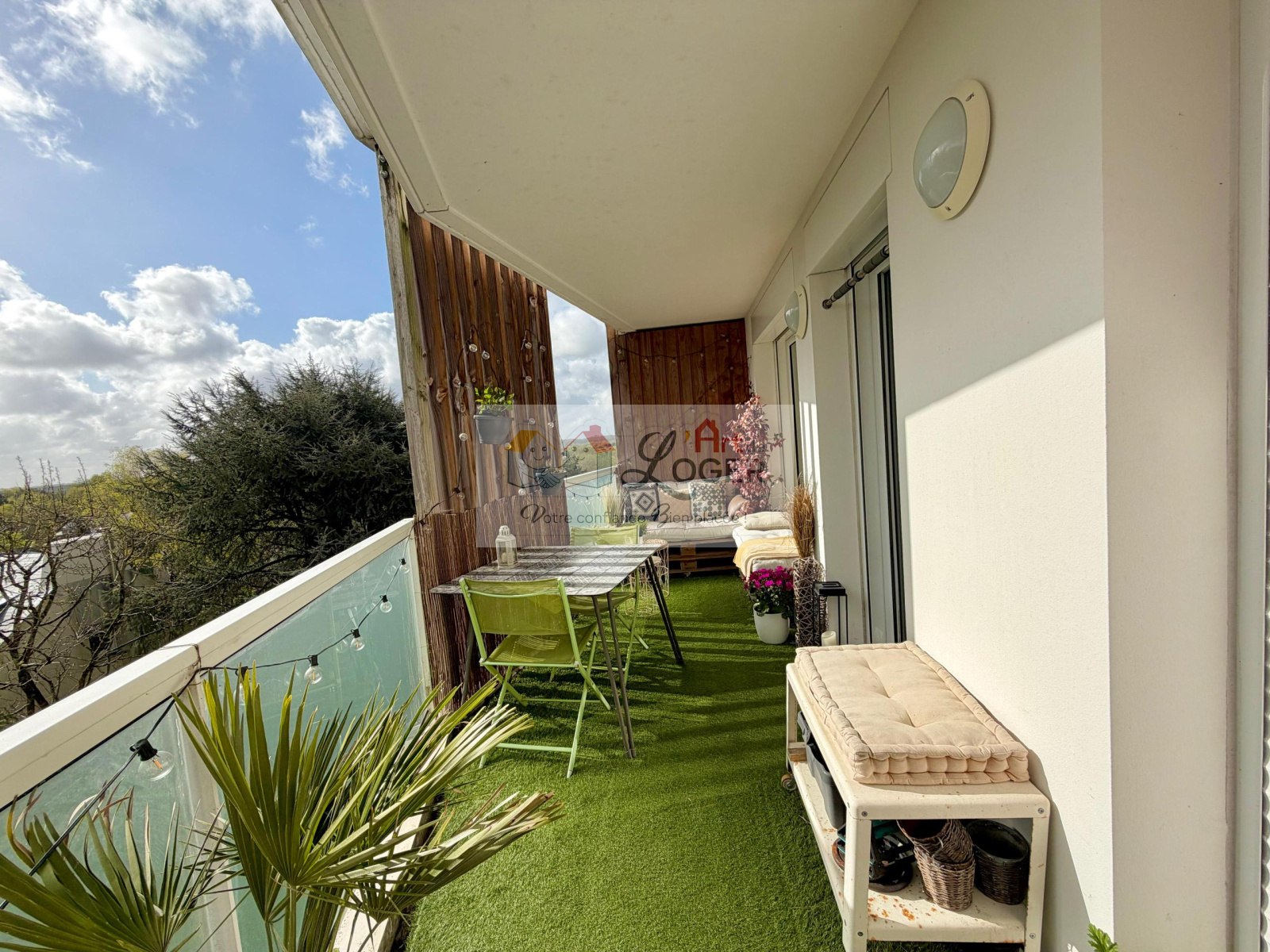 Un balcon arboré prolonge l'ensemble , invitant à des moments paisibles dans un environnement verdoyant.